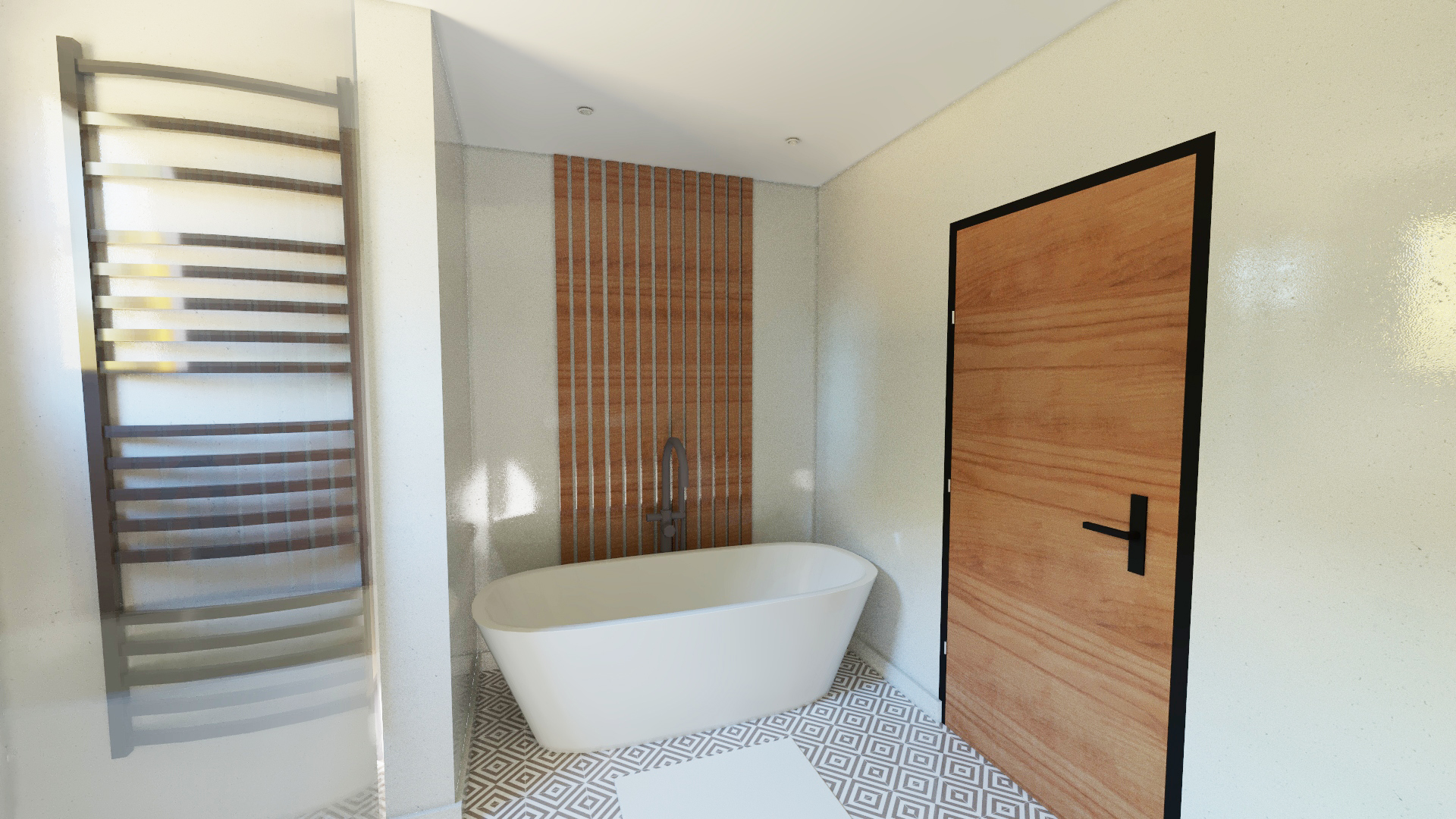 2 consignes pour cette salle de bains : une douche ET une baignoire et des matériaux nobles. Pari réussi avec un espace lumineux qui invite au calme et au bien-être. Les murs en béton ciré beige, les carreaux de ciment au sol, la paroi vitrée jusqu’au plafond et les éléments en bois apportent minéralité et authenticité à la pièce. Les spots à intensité variable permettent de créer une ambiance sur mesure suivant les envies. Agrémentée de quelques serviettes et tapis dans les couleurs beiges ou crème, cette salle de bains deviendra une pièce phare de la maison !